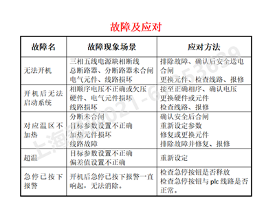 工業(yè)烤箱操作說明 1.接入三相五線電源(市電380V),確認安全后送電。 2.合上電氣柜內(nèi)總斷路器及各功能部位分斷路器,至操作側(cè)打開電源開關(guān)。 3.電源電壓正常,至各溫區(qū)依次打開加熱開關(guān),按所需各目標參數(shù)寫入各區(qū)控溫表和超溫表,系統(tǒng)啟動工作。工業(yè)烤箱具體緊急處理方法見下表: